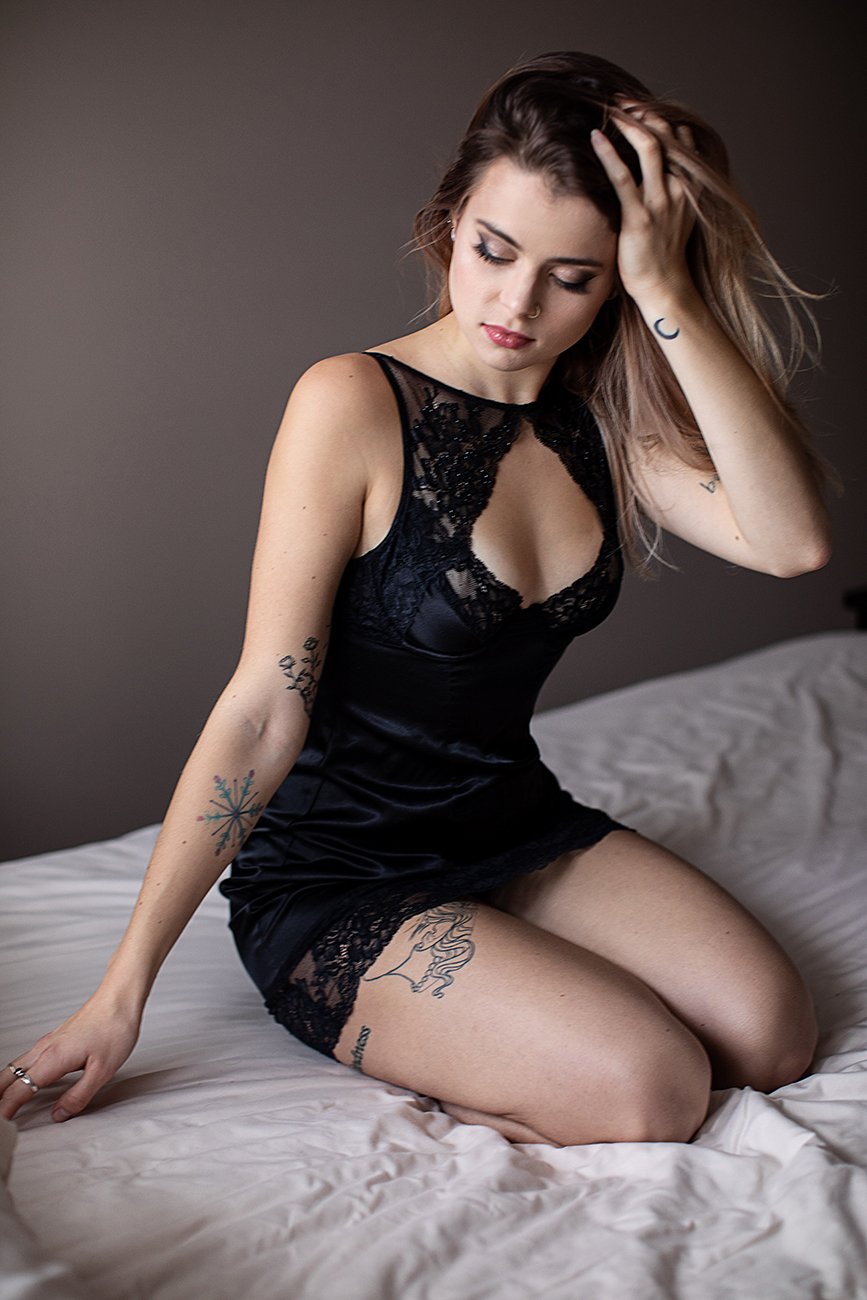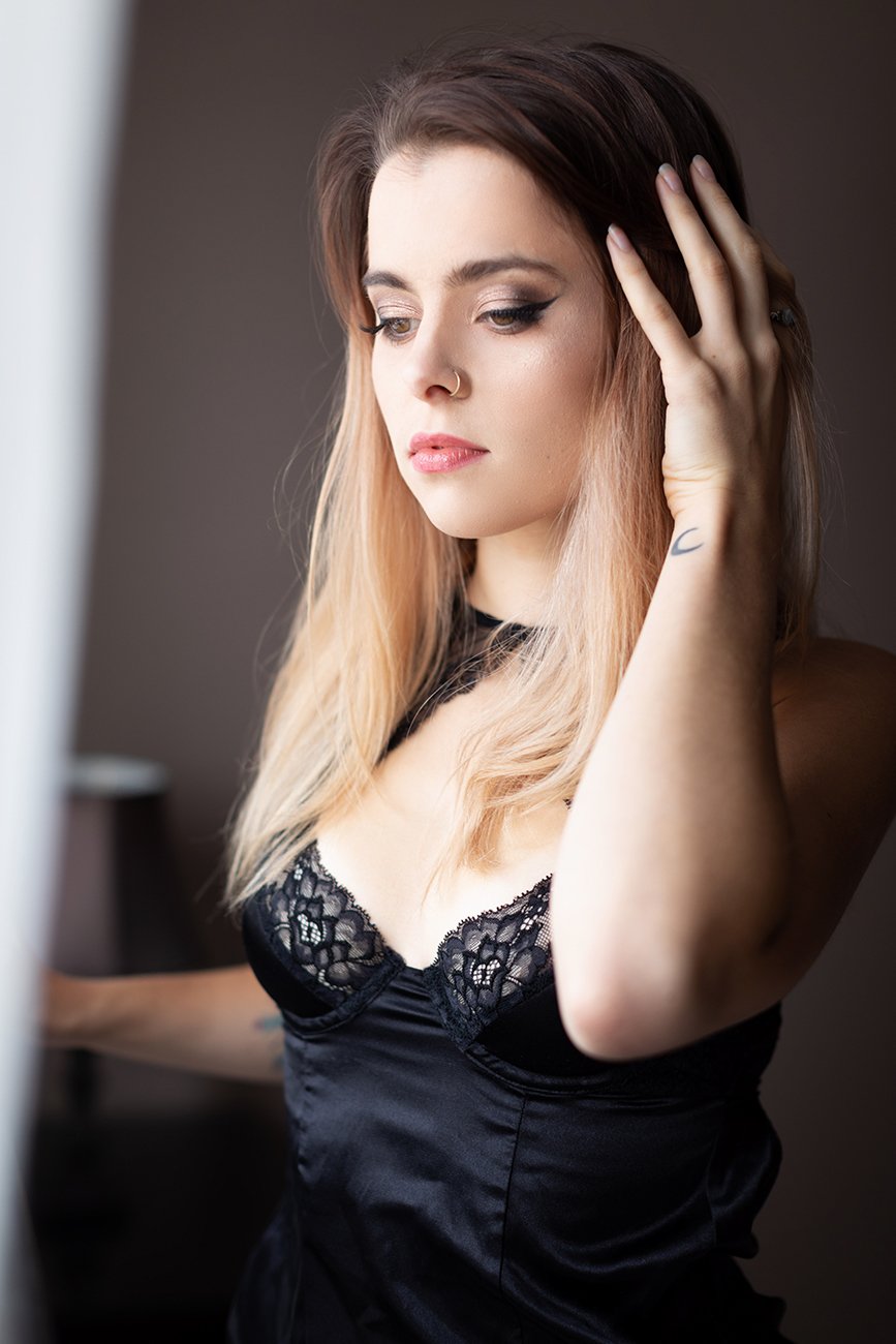 I find looking off from the camera adds mood. It can make the viewer feel like they are looking at a photo of a person who is living in the moment and not posing, like a glimpse into someone’s life. I find this especially to be the case with boudoir because boudoir is more intimate and personal in general.