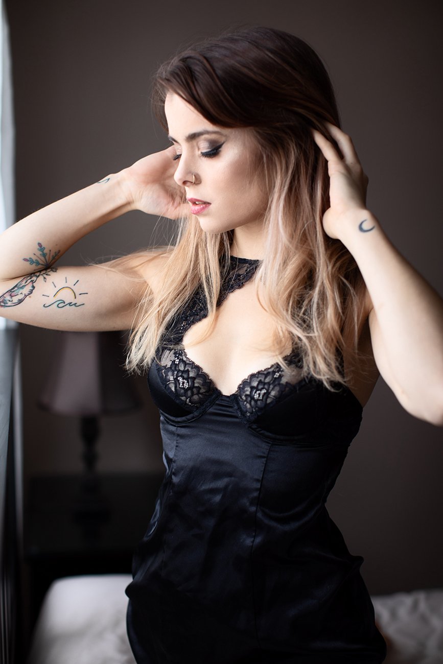 Before boudoir sessions I always discuss with my subject what style of photos they are looking for. Camille and I decided on a bedroom set with natural light. I love working with natural light, but the opportunities to do so during the winter months can be limited. I try to take advantage of any opportunity that comes my way so long as it matches the style we are after. Camille had brought a bunch of outfits and left her hair down and straight.