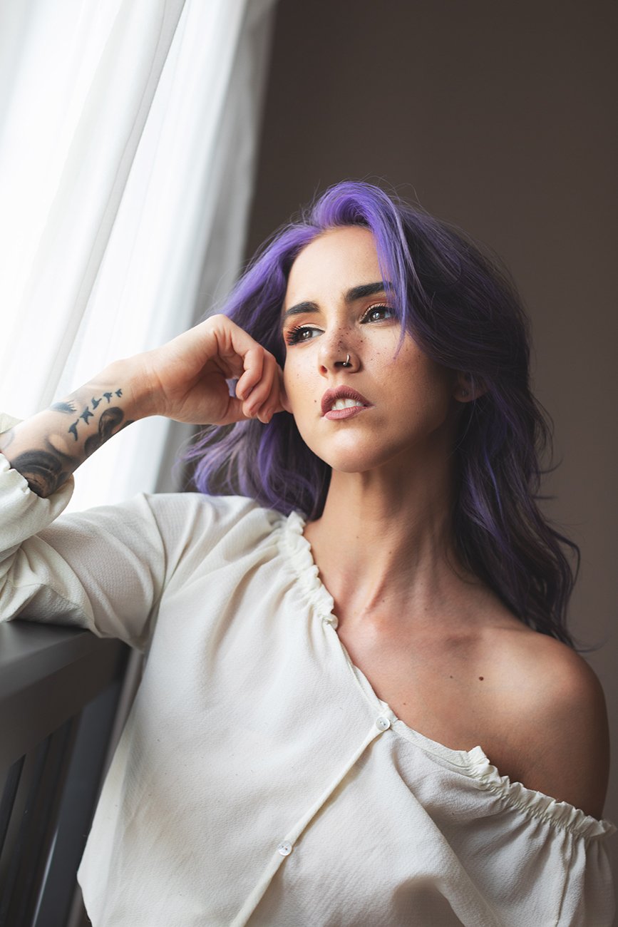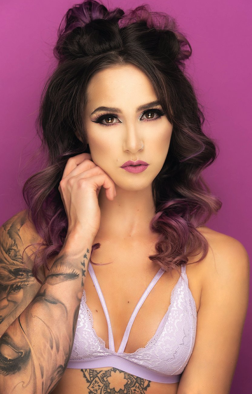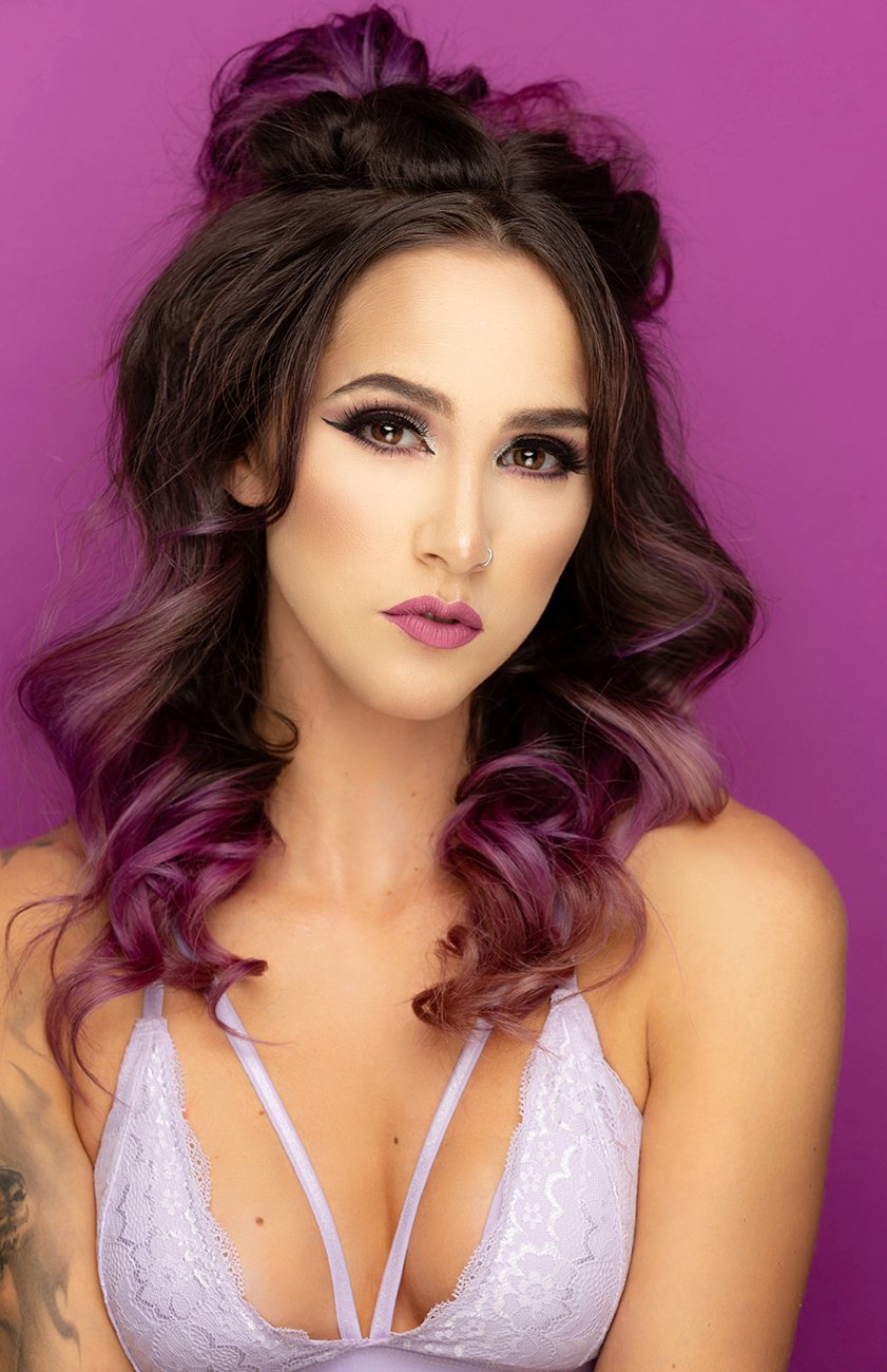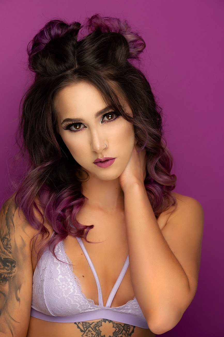 I definitely picked the purple background after I saw her hair colour. I remember thinking I was gonna use a red background but then changed my mind. Also pairing that with a light purple bra. Yes, Yes, YES!