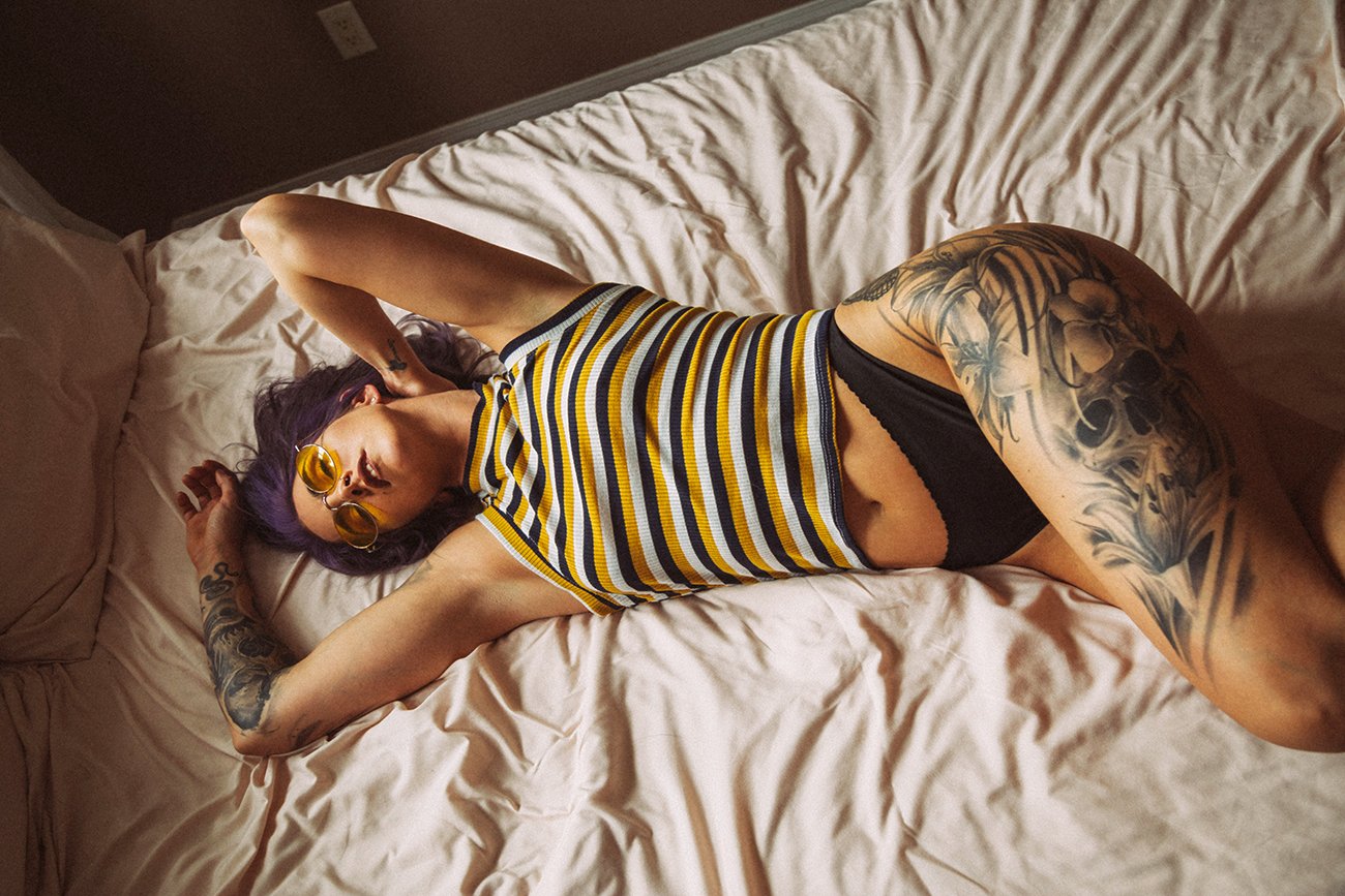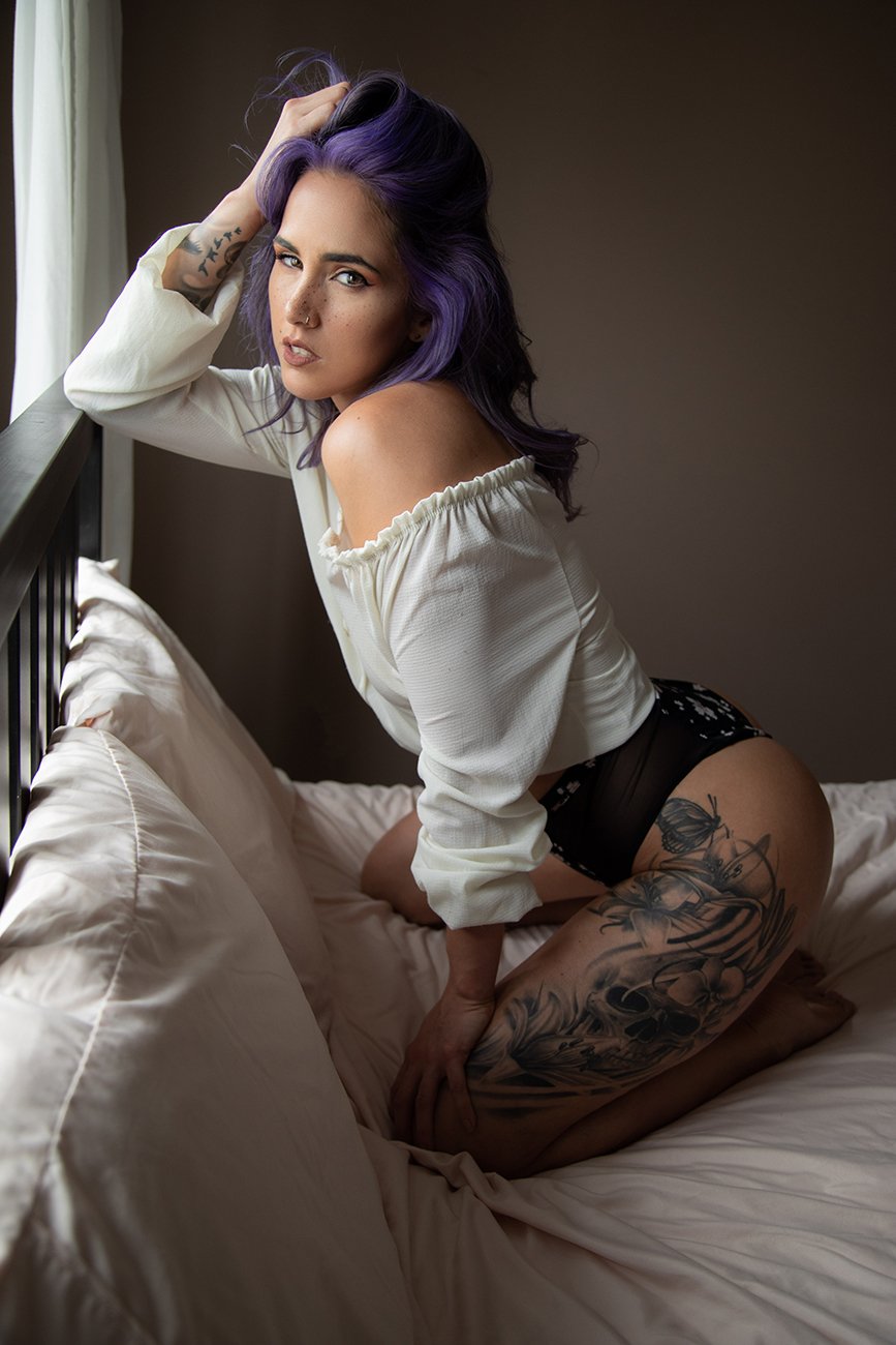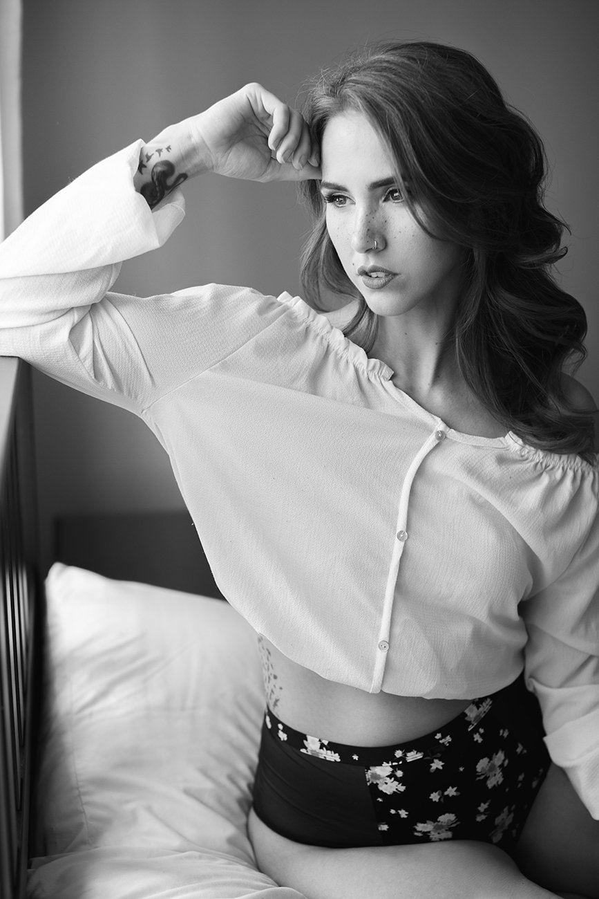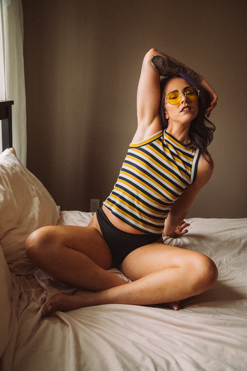 The second shoot I’m gonna show is boudoir in a bedroom setting using natural light. We had two looks for this shoot. First looks (above) is a natural beauty look and the second is a 70’s wild child look.