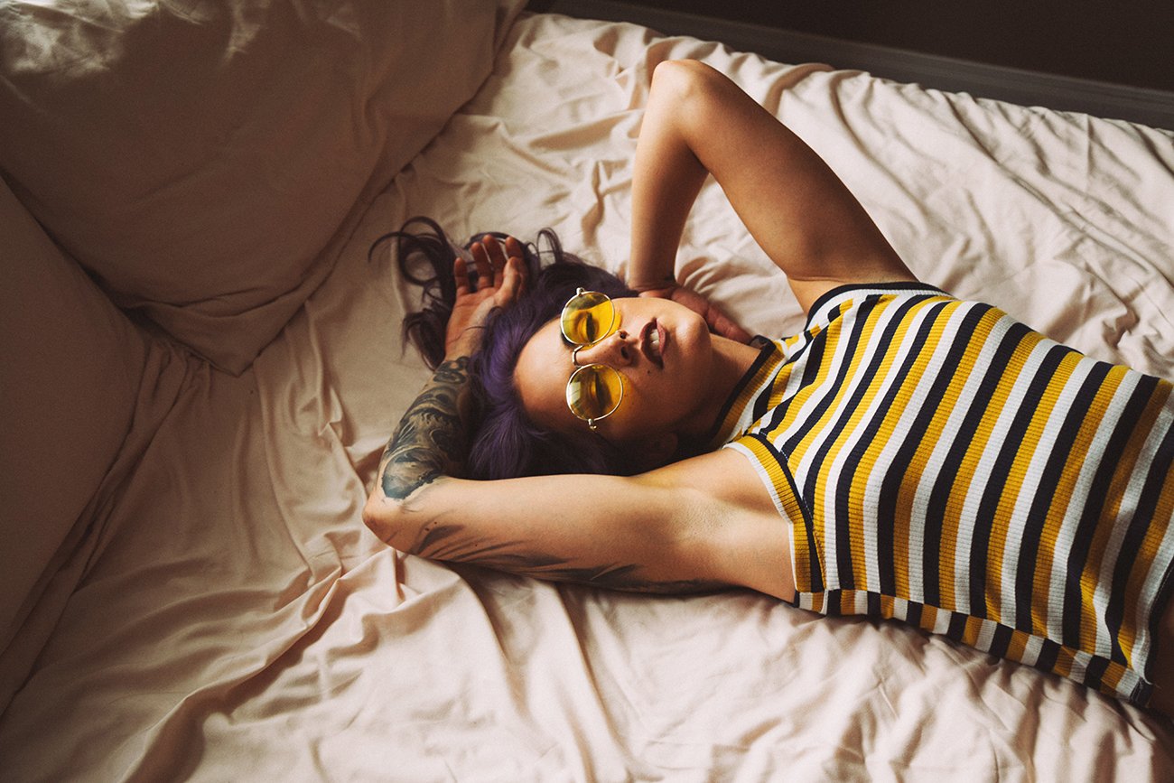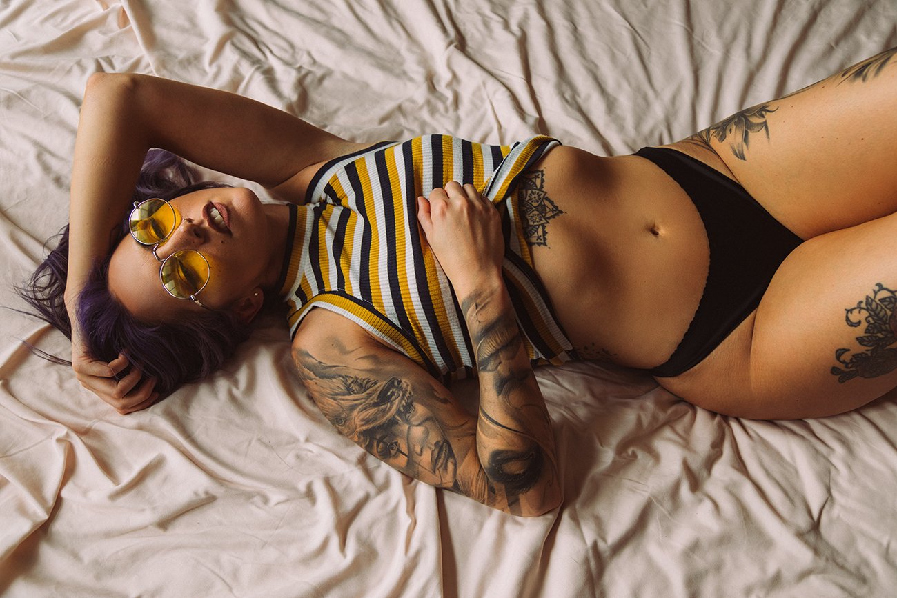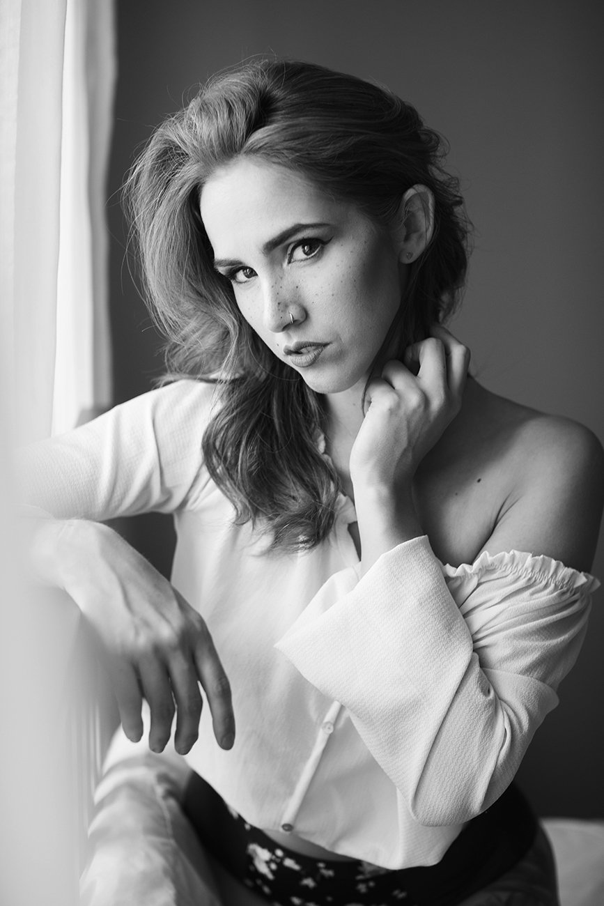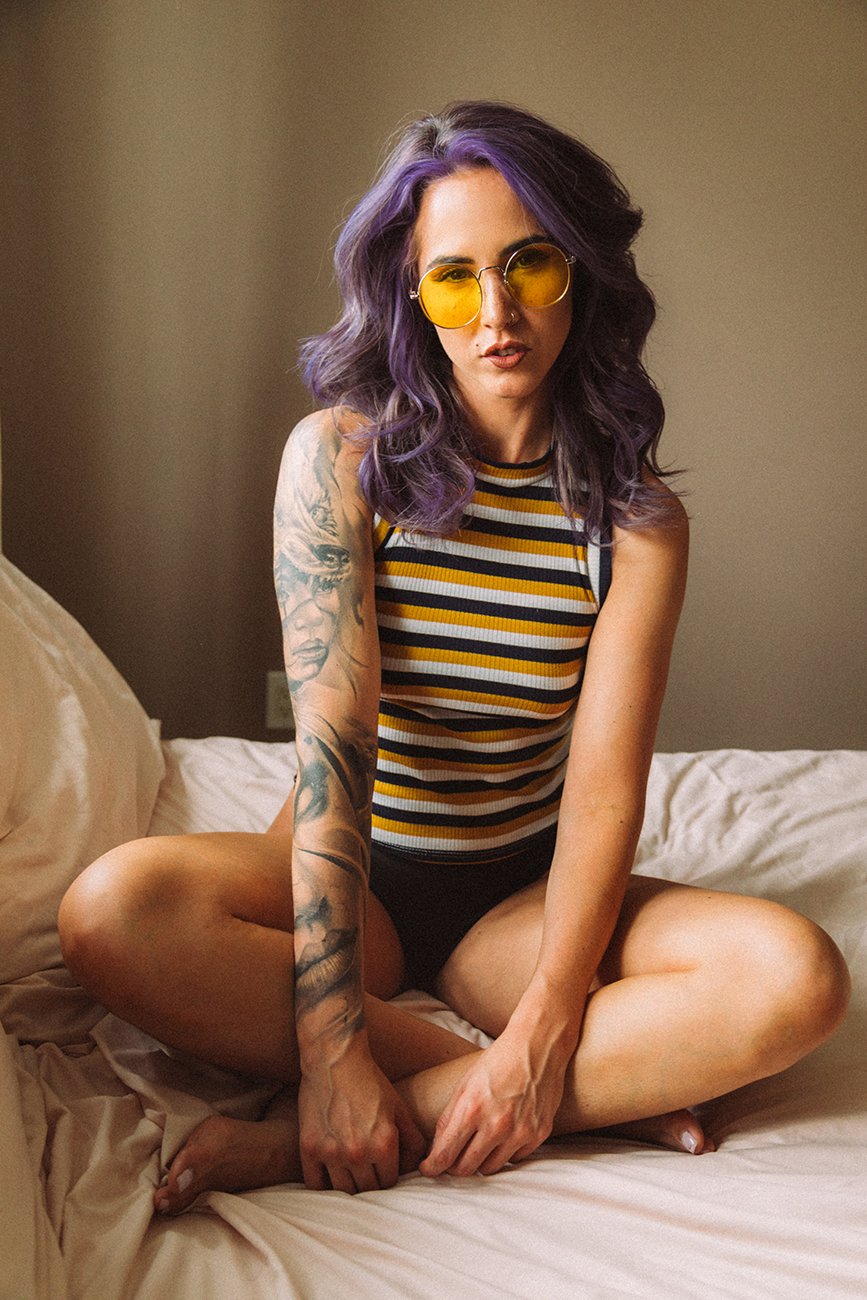 The second shoot I’m gonna show is boudoir in a bedroom setting using natural light. We had two looks for this shoot. First looks (above) is a natural beauty look and the second is a 70’s wild child look.