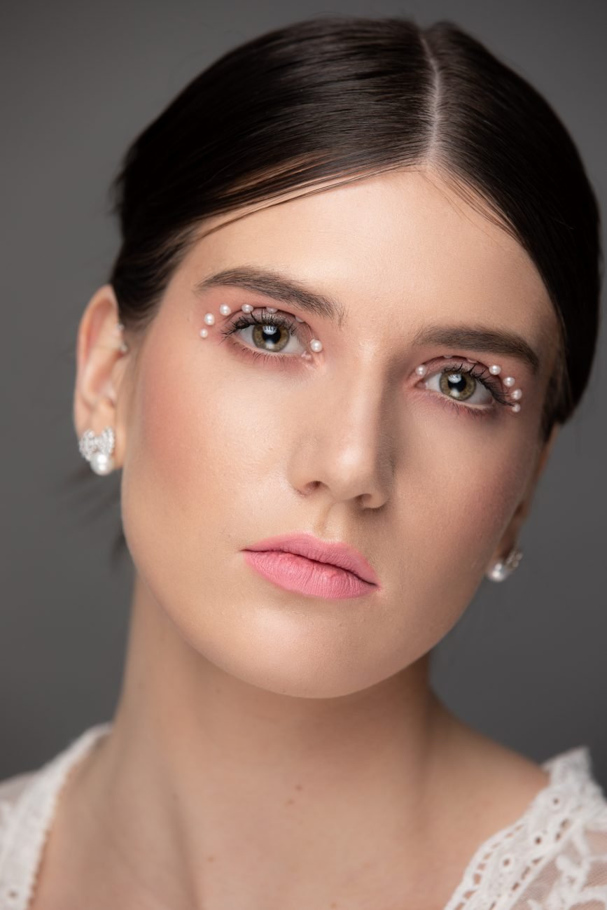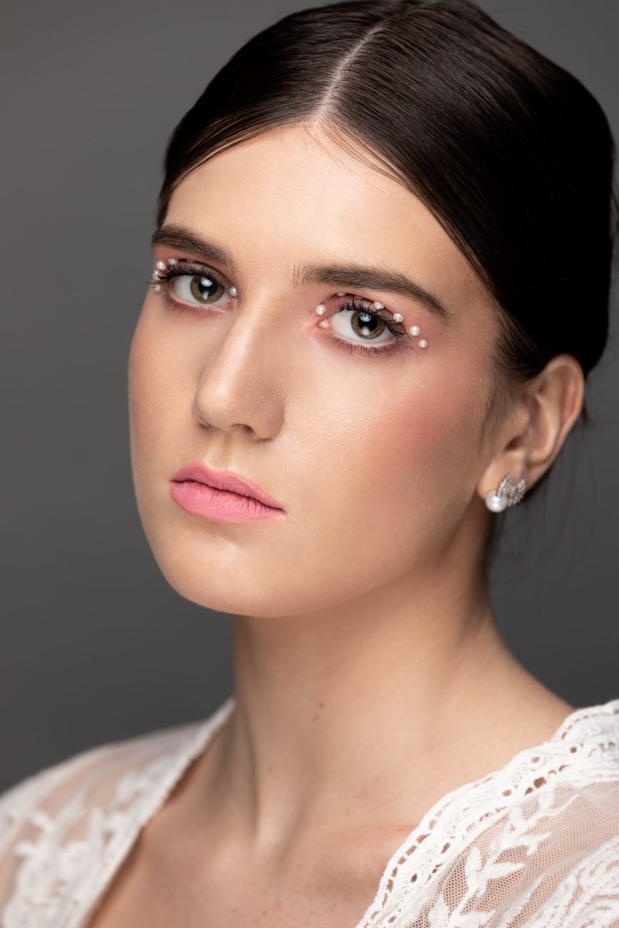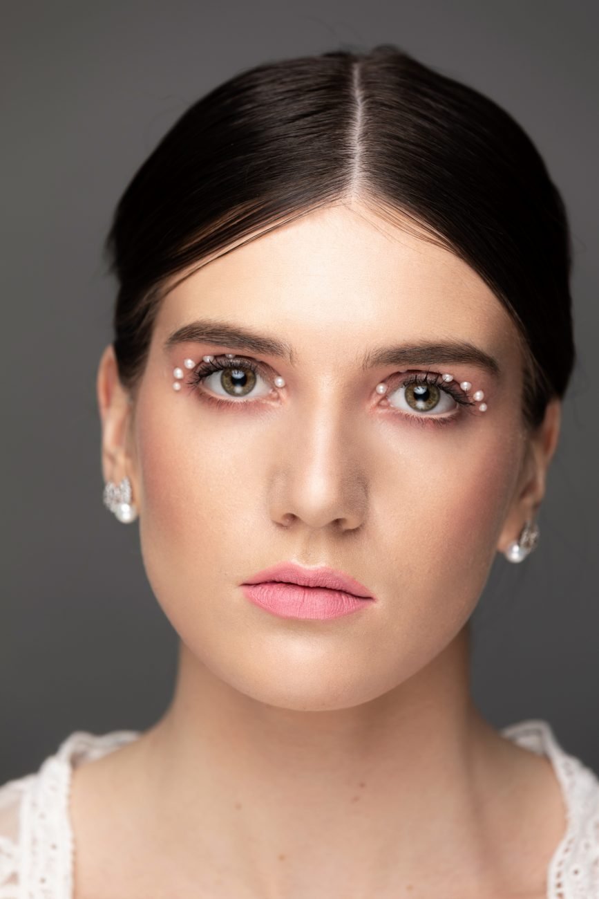 Our first look was with the beautiful, Laina. Carolyn kept the hair tied back so it would not take attention away from her makeup look. She accessorized the looks with pearl earrings similar to the jewels on her eye lids. She kept the makeup super soft and clean. Carolyn is an amazing makeup artist.