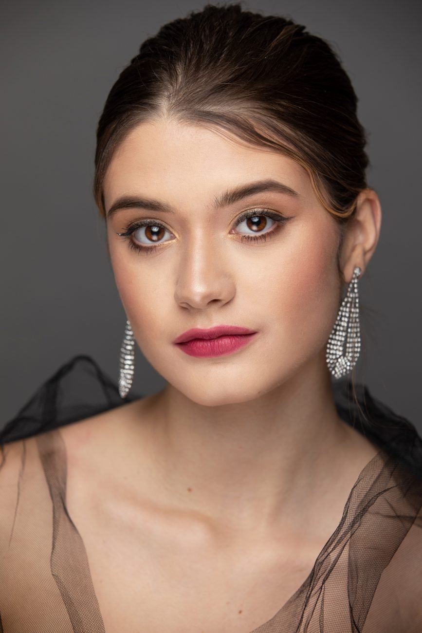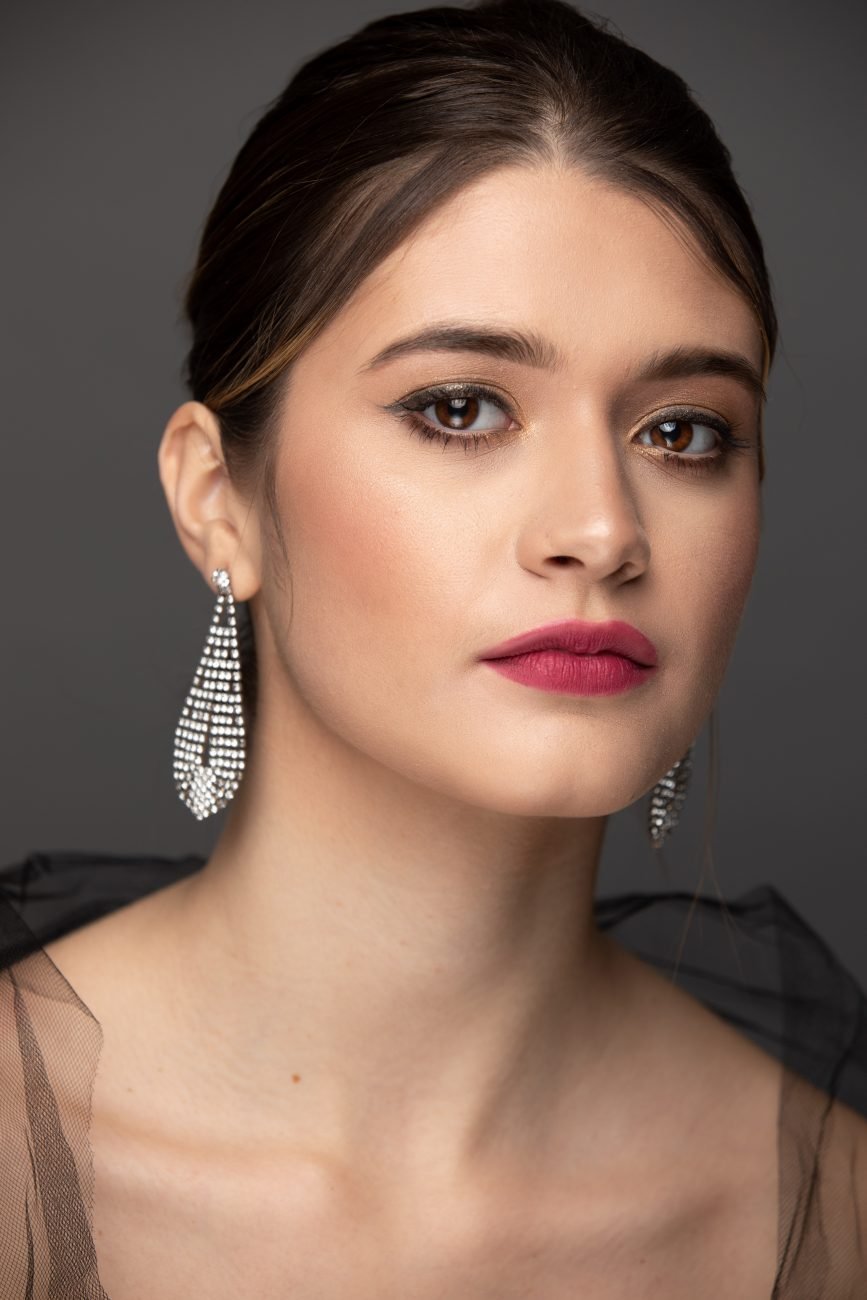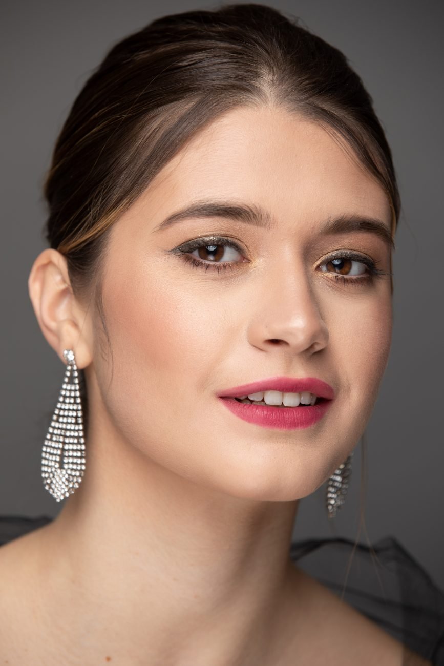Our first look was with the beautiful, Laina. Carolyn kept the hair tied back so it would not take attention away from her makeup look. She accessorized the looks with pearl earrings similar to the jewels on her eye lids. She kept the makeup super soft and clean. Carolyn is an amazing makeup artist.