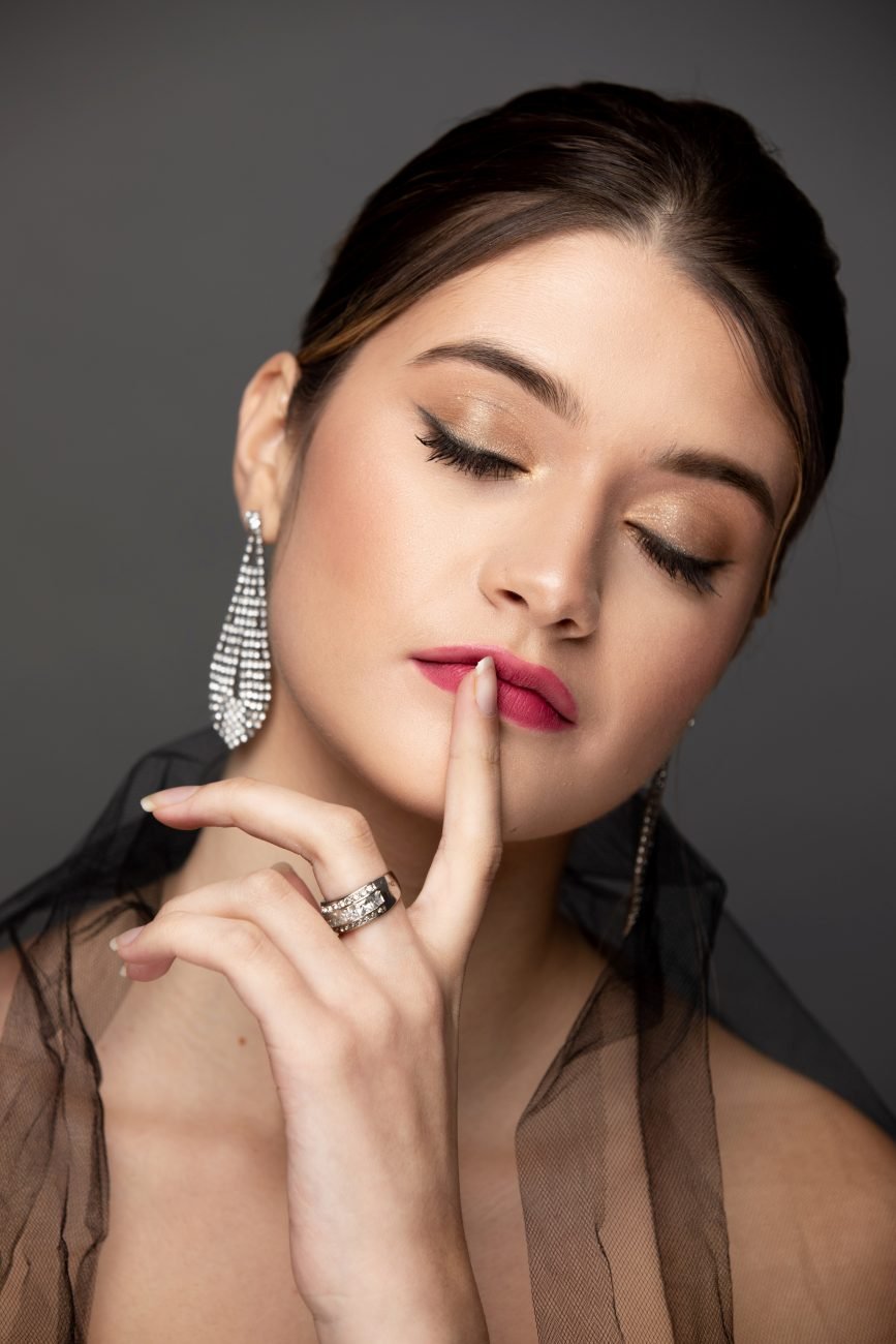 The second look was with the gorgeous model, Nadia. Carolyn did a more dramatic look with darker eye shadow and lipstick. She also accessorized Nadia with teardrop dangle earrings and a silver ring. Both of these models are very beautiful so working with their beauty came easy.